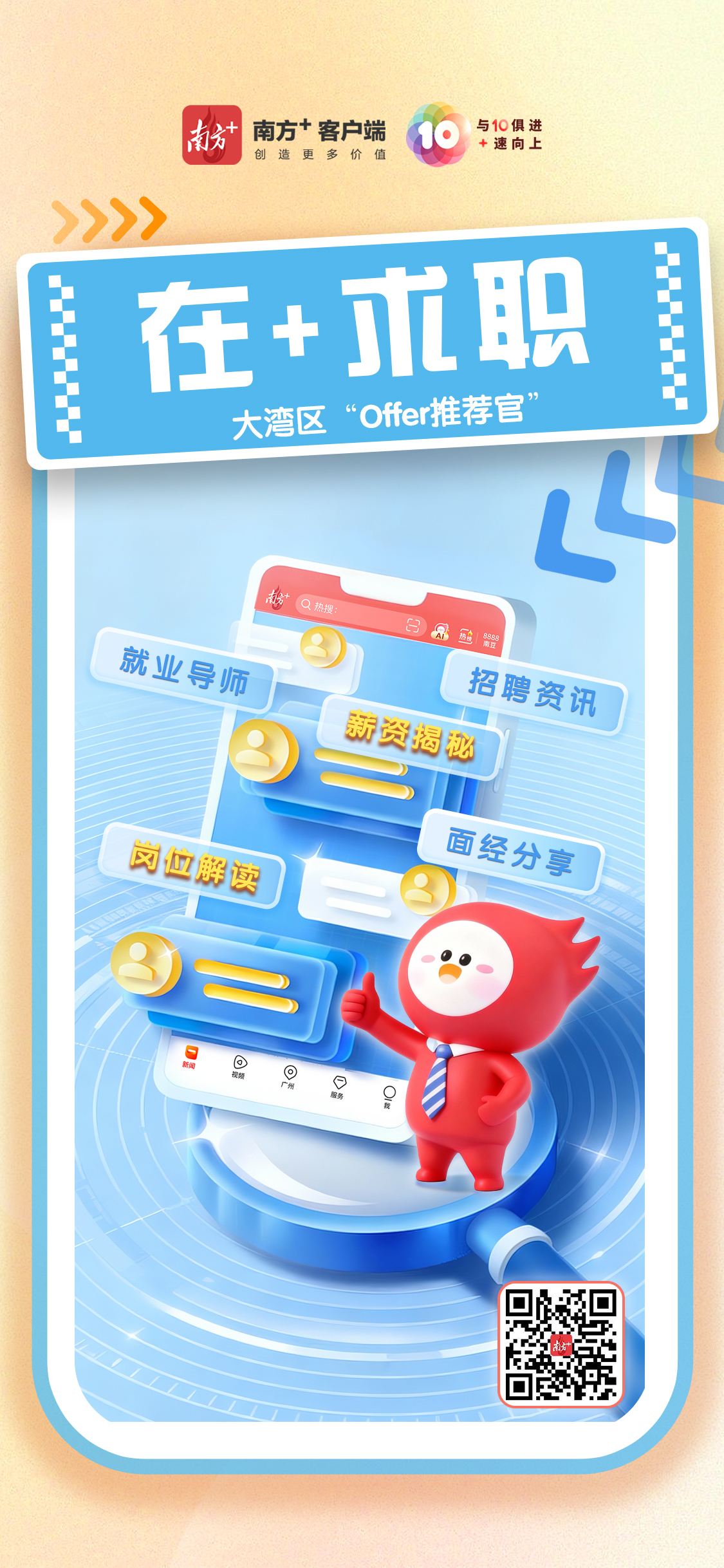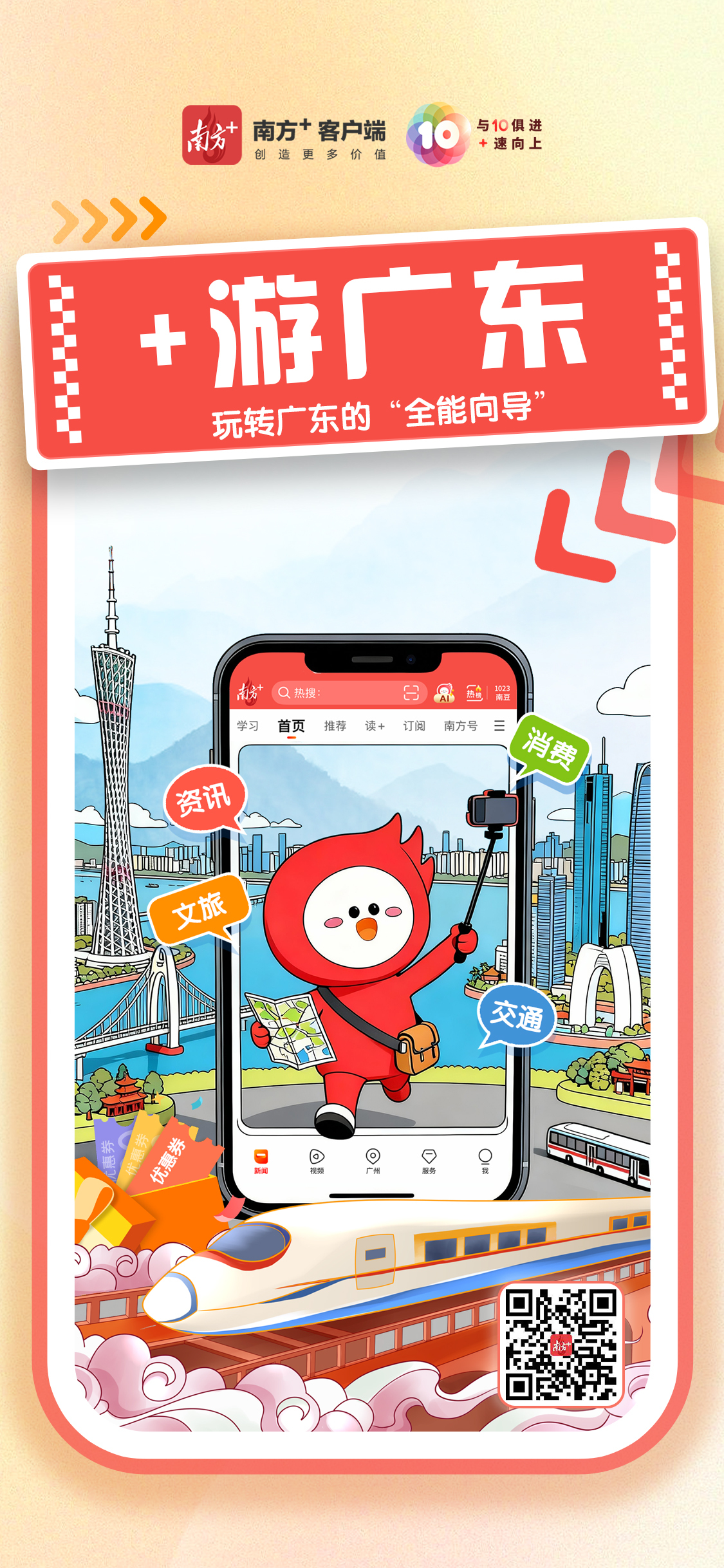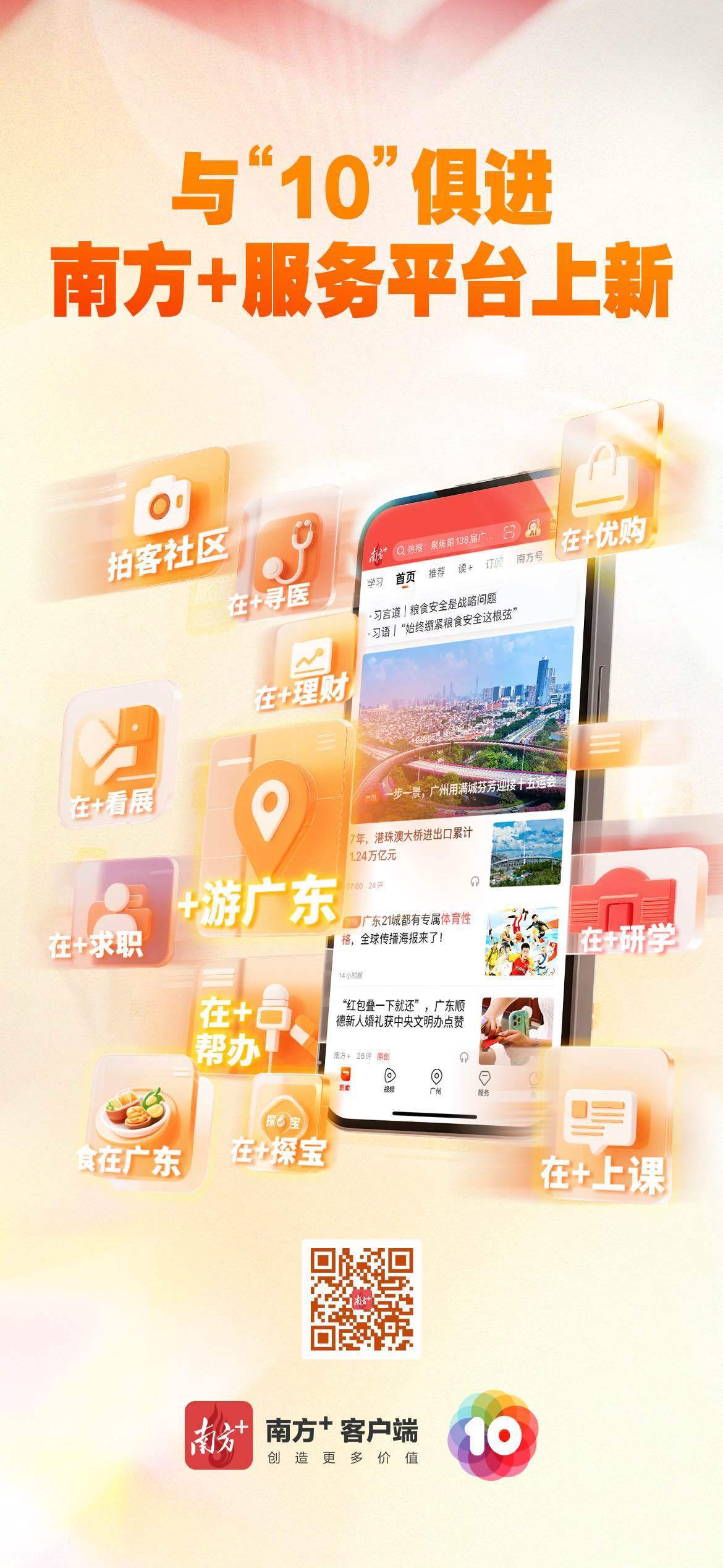 与10俱进,+速向上。10月23日,南方+客户端迎来上线十周年。3600多个日与夜,南方+始终坚持“创造更多价值”,2亿多用户在这里读懂广东、读懂大湾区、读懂中国。站在10周年新的起点上,南方+将更加重视深度连接用户、服务用户,深入推进主流媒体系统性变革,焕新推出与升级“+游广东”“食在广东”“在+帮办”“在+优购”等服务平台,秀“10”力、倍宠粉,努力成为更多用户的“实用收藏夹”。