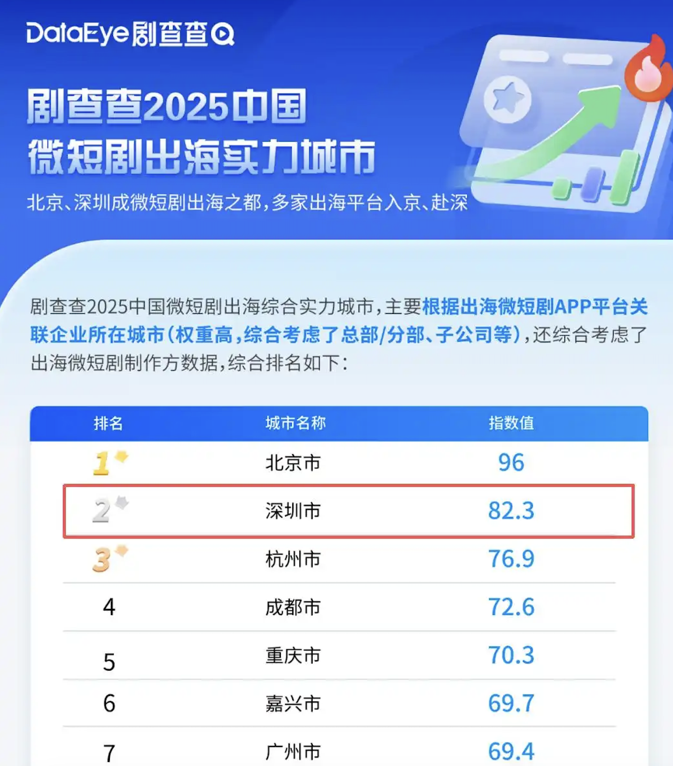 事实上,这并非深圳首次登榜——10月艾媒咨询发布的《2025年中国微短剧产业综合实力榜十强城市》中,深圳同样跻身前五,在行业影响力及传播声量等方面展现出强劲的综合实力。